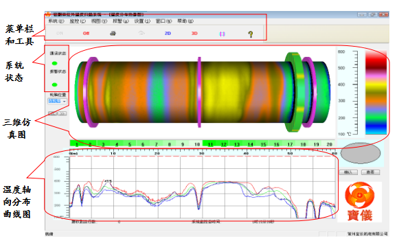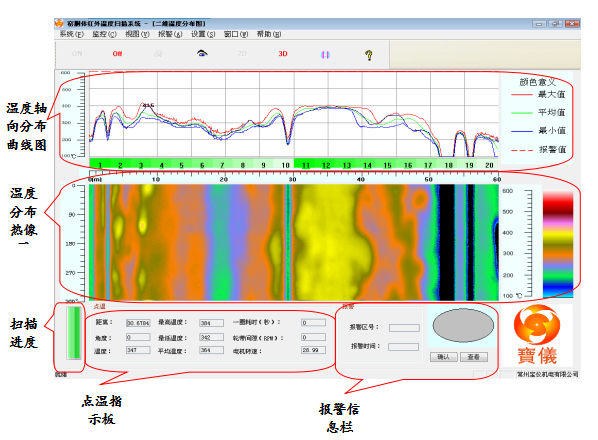 紅外掃描測(cè)系統(tǒng)的最大優(yōu)勢(shì)是非接觸、紅外線測(cè)溫、快速準(zhǔn)確、運(yùn)行周期長(zhǎng)、真正無損檢測(cè)、解決了回轉(zhuǎn)窯運(yùn)動(dòng)所造成的測(cè)溫難的難題。它通過高速旋轉(zhuǎn)的直流無刷電機(jī)帶動(dòng)紅外掃描儀內(nèi)部掃描探頭高速旋轉(zhuǎn),掃描探頭旋轉(zhuǎn)一圈,對(duì)窯表皮形成一條測(cè)溫掃描線,掃描探頭的掃描頻率為25-50線/S,每條測(cè)溫掃描線由3072個(gè)熱點(diǎn)組成。窯旋轉(zhuǎn)一周,為一個(gè)掃描周期。所采集的紅外線通過紅外探測(cè)器進(jìn)行光電轉(zhuǎn)換,傳輸至計(jì)算機(jī),通過安裝在計(jì)算機(jī)上的專用軟件,對(duì)數(shù)據(jù)進(jìn)行運(yùn)算、分析,然后在顯示器上以熱像儀圖像形式顯示出來。所得熱像儀圖像為模擬將回轉(zhuǎn)窯以0~360°展開圖。
