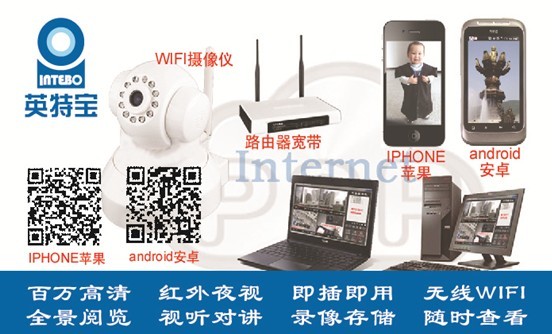 本公司從2007年開始研發(fā)系列遠(yuǎn)程網(wǎng)絡(luò)攝像機(jī),并注有“英特寶”商標(biāo),現(xiàn)隆重推出第三代無線WIFI英特寶攝像儀。 特點(diǎn):無線音視頻傳輸、手機(jī)電腦監(jiān)控對(duì)講
